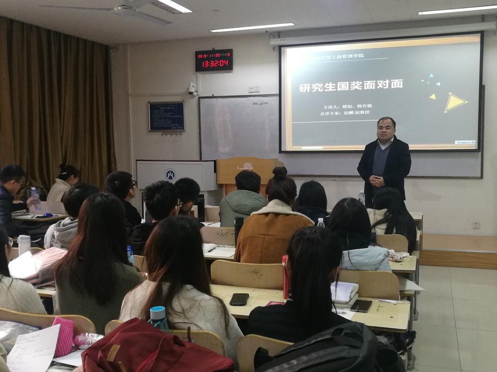 接下来徐鹏对两位同学的分享进行总结点评。他对获得国家奖学金和校长奖学金的同学表示了祝贺。徐鹏以快乐和幸福的区别引入此次点评,他强调不管决定是否要读博,科研都是每个研究生的主业,通过科研获得的逻辑思维和语言文字上提升,是无法替代的。