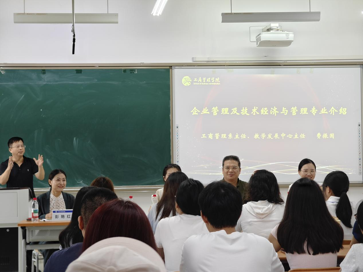 随后,学院各系主任及教师代表就所在专业的研究方向和领域分享经验和见解。费振国对企业管理、技术经济与管理专业培养方案的调整进行了详细介绍,围绕理解研究生生涯、理解研究及学者养成三个方面向同学们分享了读研期间如何做好学问。