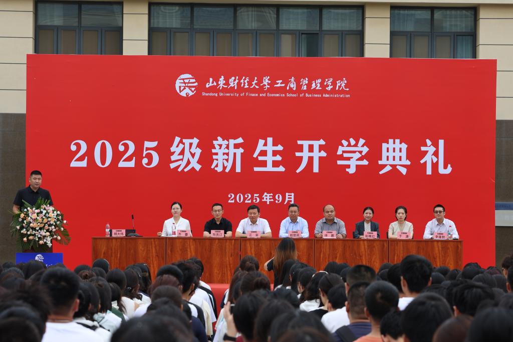 9月5日上午,我院2025级新生开学典礼在章丘校区隆重举行。学院党委书记赵世民、院长徐鹏、副院长江岩、党委副书记彭艳红、副院长陈庆江、2006级工商管理专业校友、招商银行淄博分行副行长李蓬勃、院长助理于潇、人力资源与组织行为系教师齐蕾、辅导员老师和3名博士研究生、36名硕士研究生和547名本科生参加典礼。典礼由学院党委副书记郑大伟主持。