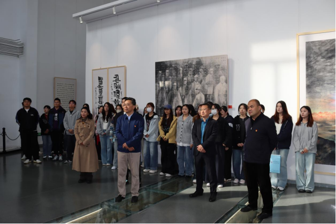 步入展厅,各类书画作品以鲜明的主题、厚重的笔触勾勒出十四年抗战的峥嵘岁月。在专业讲解员的细致引导下,师生们驻足凝视、认真聆听,深入了解每件作品背后的创作背景、时代意义与文化内涵,师生们频频驻足交流,沉浸式感受伟大抗战精神的时代力量。